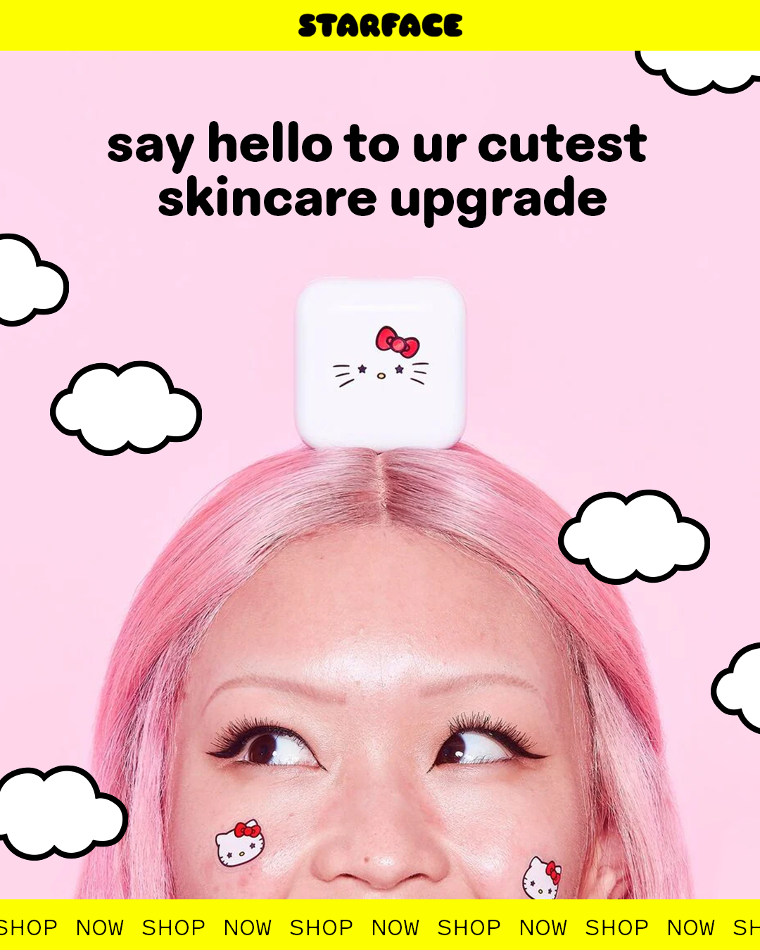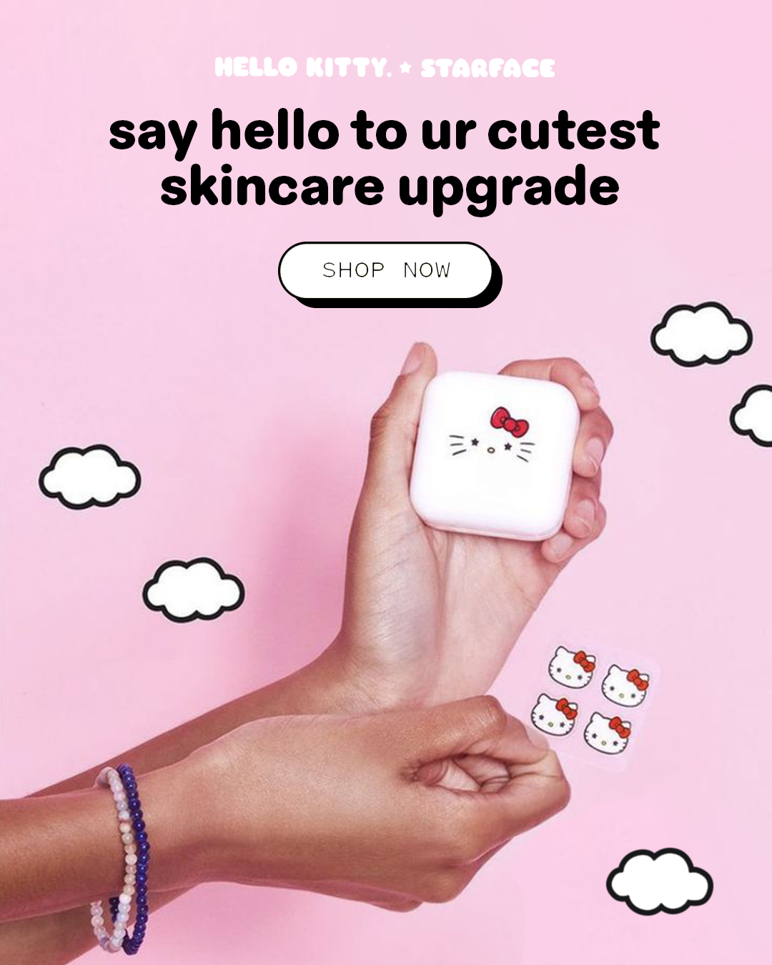 to clear things up”: This concept combines playful wordplay with visual motion to announce the collection in a fun, dynamic way. The phrase “Hello Kitty just dropped in to clear things up” nods to both clear skin and the official launch of the collection—while tying in the visual metaphor of Hello Kitty and product elements falling gently from the clouds.