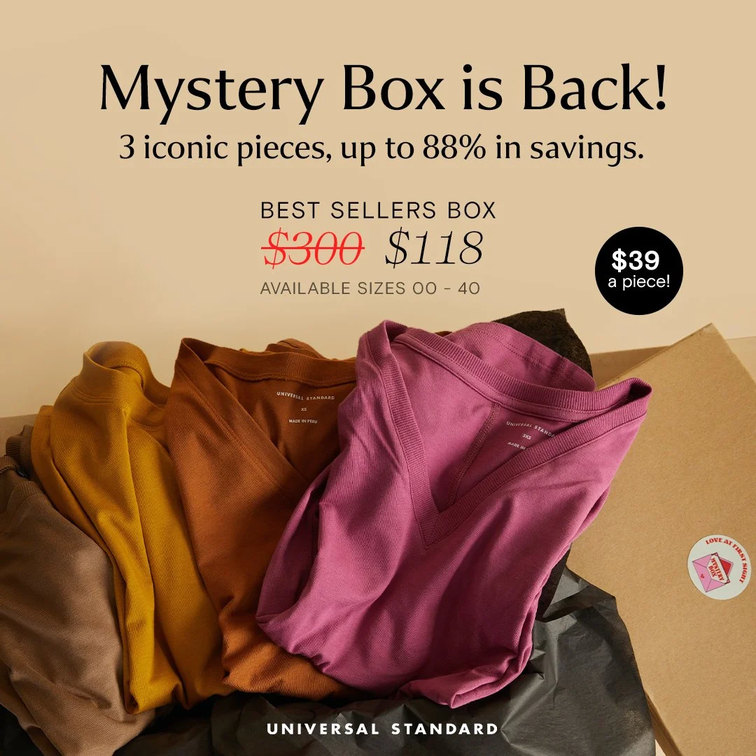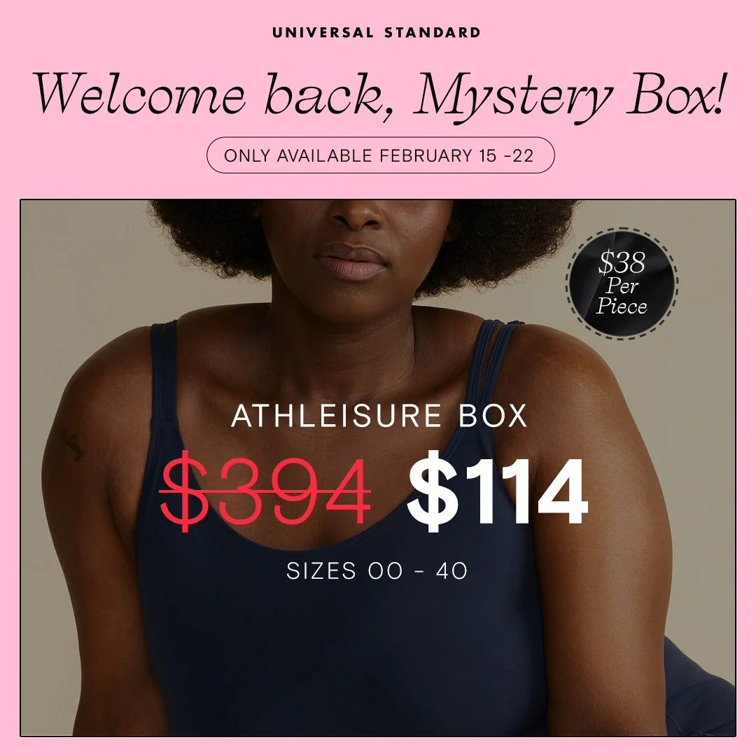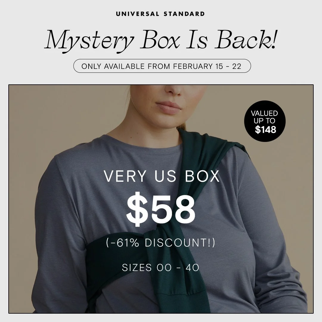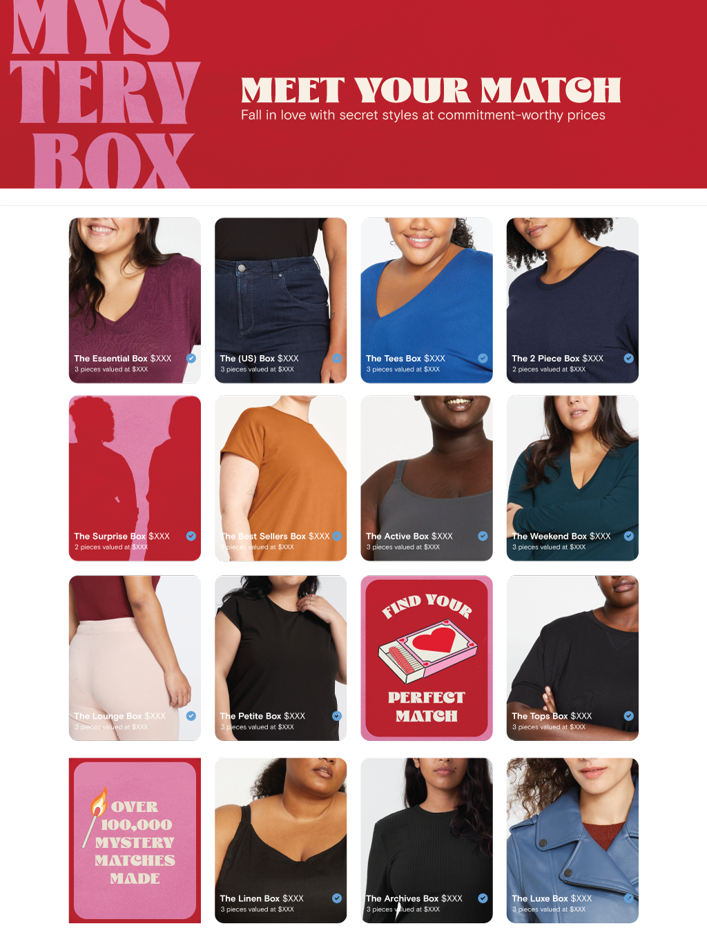 VDay Mystery Bundle Campaign: Designed assets to support A/B testing between original brand visuals and a themed campaign inspired by dating apps, playing on the idea of “finding your perfect match.” Created a range of static and motion graphics that highlighted Universal Standard’s focus on perfect fit. Also developed hybrid designs that fused both visual directions to maintain brand recognition while introducing a playful, campaign-specific twist.